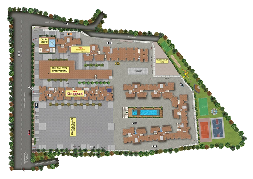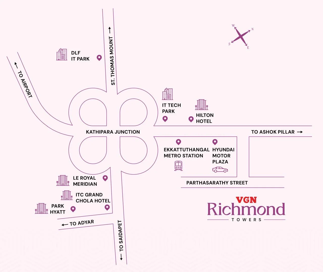 VGN Richmond Towers is strategically located in the heart of Guindy, one of Chennai's most prominent commercial and residential hubs, and a central point in the city. Just 1 km from Kathipara Junction, it offers seamless connectivity to Anna Salai. With Guindy and Ekkattuthangal Metro Station within walking distance, commuting is effortless. The area is home to major landmarks like Guindy National Park, making it an ideal location for both business and lifestyle. Surrounded by Saidapet, Adyar, Nandanam, and Ashok Nagar, VGN Richmond Towers ensures a luxurious living experience with unparalleled connectivity.